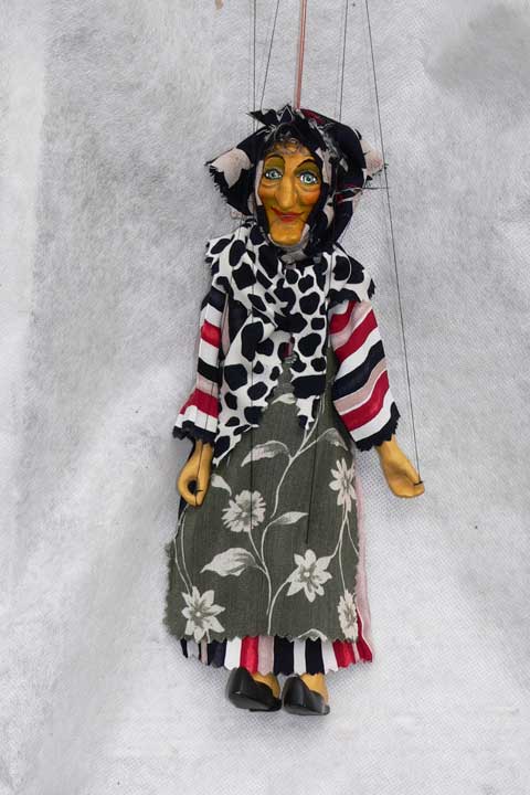 Baba Gingema originální česká loutka marioneta s niťovým vedením rukou a vahadlem.