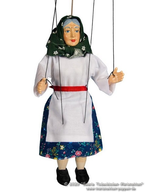 Babička klasická loutka marioneta na drátě, vedená systémem Münzbergova válečku. Hlava a končetiny loutky jsou odlévány z modifikací sádry. Další části je dřevěné a spojovací díly jsou vyrobeny z poměděného drátu. Ruční malba loutky je prováděna nezávadnými vodostálými barvami, testovanými pro použití na dětské hračky. Loutka jsou určená jako originální edukativní hračka dětem od 3 let. Nebo jako postavička pro loutkové divadlo a taky však jako jedinečný český suvenýr či hezký dárek.