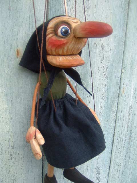 Babička sbírková celodřevěná loutka marioneta. Loutka marioneta vypracovaná klasickou řezbářskou technikou z lipového dřeva, konzervovaného včelím voskem a namalovaného transparentně olejovými barvami, takže charakter dřeva je zachován. Má ovládací vahadlo, které umožňuje pohyb na profesionální divadelní úrovni. Nezvyklý dárek nebo odborný herec pro profesionální loutková divadla. Nádherná autorská dřevořezba, exkluzivní dárek. Tyto loutku marionetu děláme na objednávku , 5-6 týdnů