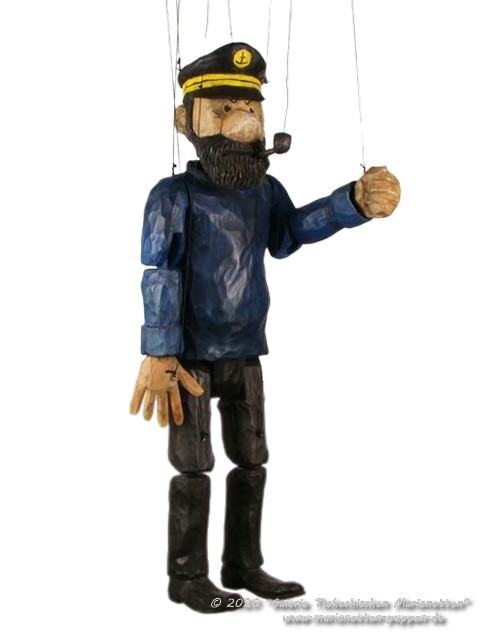 Captain Haddock sbírková celodřevěná loutka marioneta. Loutka marioneta vypracovaná klasickou řezbářskou technikou z lipového dřeva, konzervovaného včelím voskem a namalovaného transparentně olejovými barvami, takže charakter dřeva je zachován. Má ovládací vahadlo, které umožňuje pohyb na profesionální divadelní úrovni. Nezvyklý dárek nebo odborný herec pro profesionální loutková divadla. Nádherná autorská dřevořezba, exkluzivní dárek.