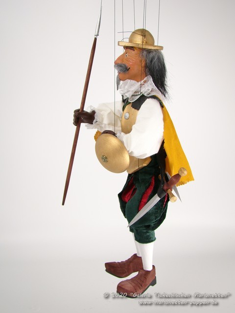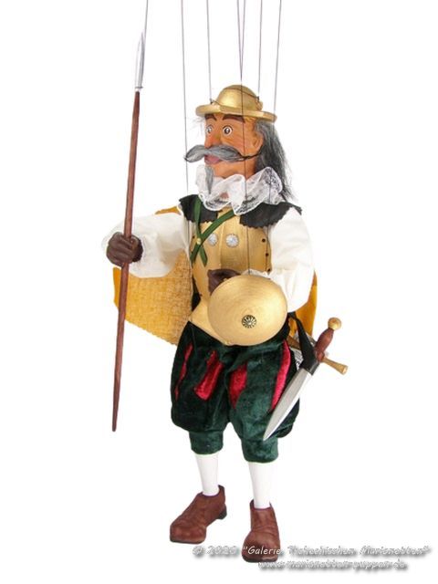 Don Quixote dekorativní Česká loutka marioneta. Základní hybný systém je řešen v soustavě: dřevěné vodítko a nitě. Hlava, nohy a pár rukou je odlita z tvrdé dentální sádry. Ruční malba loutky je prováděna nezávadnými vodostálými barvami, testovanými pro použití na dětské hračky. Loutka je určená jako originální hračka dětem od 4 let, jako postavička pro rodinné loutkové divadlo. Dekorativní loutka, marioneta, kterou ocení i starší a to právě díky jejich unikátnímu vzhledu. Je taky však jako jedinečný český suvenýr či hezký dárek.