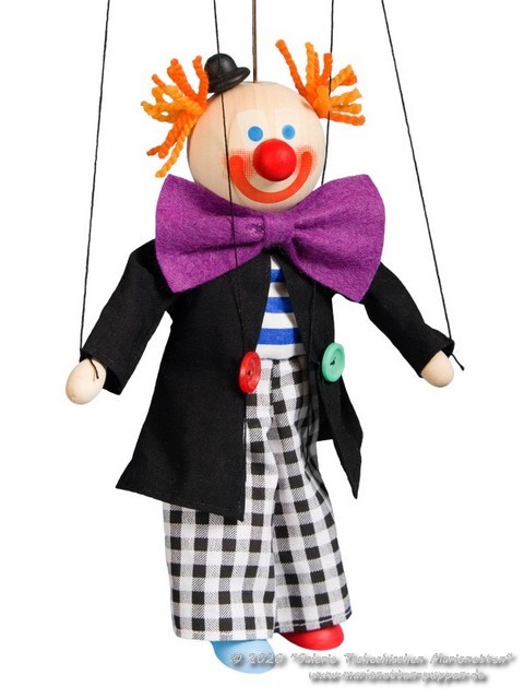 Klaun dřevěná loutka jsou typová marioneta ze dřeva na drátě. Skládá se z dřevěných dílů, z textilního ošacení a pružného vedení k dřevěnému vodítku. Hlava loutky je kulatého tvaru srůznými typy znázorněných obličejů loutkových postav. Všichni části loutky marionety jsou dřevěné. Ruční malba loutky je prováděna nezávadnými vodostálými barvami, testovanými pro použití na dětské hračky. Je oblíbeným a vhodným prvkem pro dětskou nebo rodinnou loutkohru do loutkového divadla
