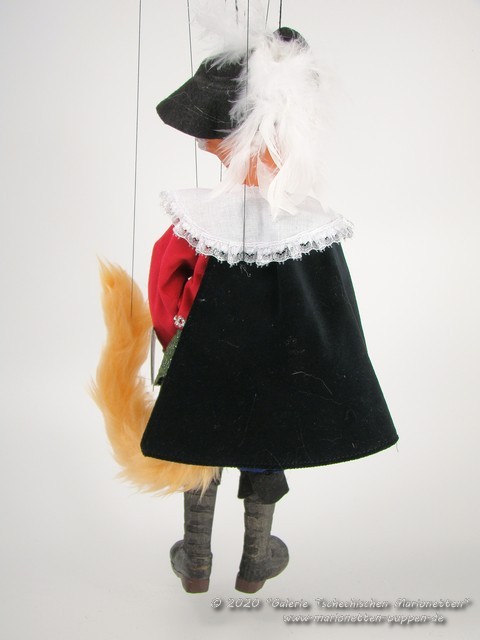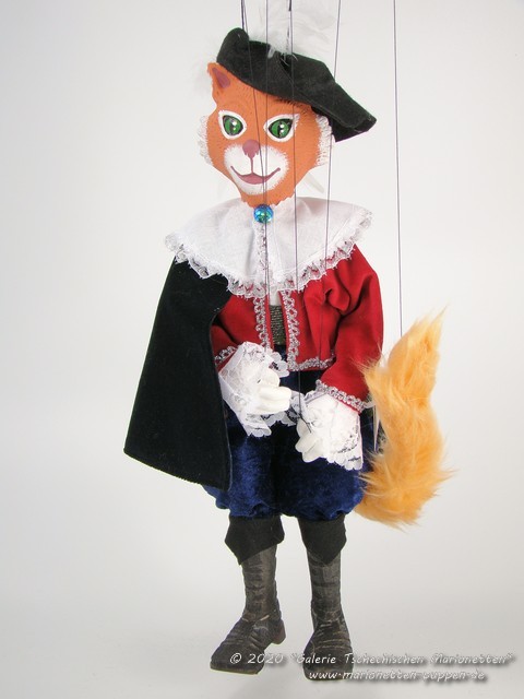 Kocour v botách dekorativní Česká loutka marioneta. Základní hybný systém je řešen v soustavě: dřevěné vodítko a nitě. Hlava, nohy a pár rukou je odlita z tvrdé dentální sádry. Ruční malba loutky je prováděna nezávadnými vodostálými barvami, testovanými pro použití na dětské hračky. Loutka je určená jako originální hračka dětem od 4 let, jako postavička pro rodinné loutkové divadlo. Dekorativní loutka, marioneta, kterou ocení i starší a to právě díky jejich unikátnímu vzhledu. Je taky však jako jedinečný český suvenýr či hezký dárek.