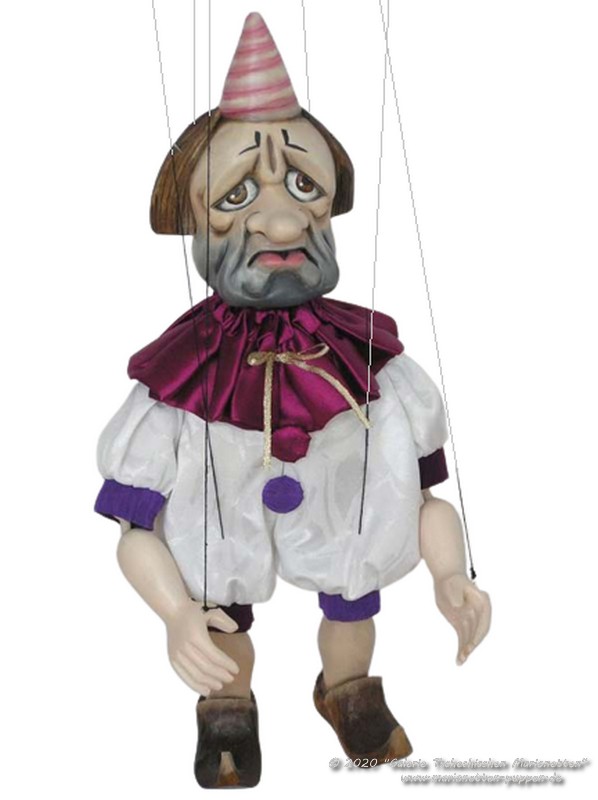 Pierot sbírková celodřevěná loutka marioneta. Loutka marioneta vypracovaná klasickou řezbářskou technikou z lipového dřeva, konzervovaného včelím voskem a namalovaného transparentně olejovými barvami, takže charakter dřeva je zachován. Má ovládací vahadlo, které umožňuje pohyb na profesionální divadelní úrovni. Nezvyklý dárek nebo odborný herec pro profesionální loutková divadla. Nádherná autorská dřevořezba, exkluzivní dárek.