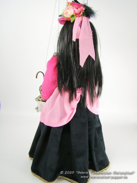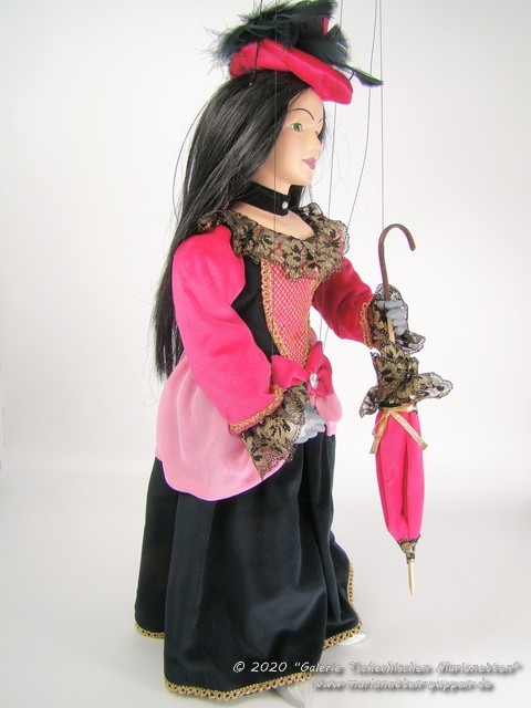 Dáma dekorativní Česká loutka marioneta. Základní hybný systém je řešen v soustavě: dřevěné vodítko a nitě. Hlava, nohy a pár rukou je odlita z tvrdé dentální sádry. Ruční malba loutky je prováděna nezávadnými vodostálými barvami, testovanými pro použití na dětské hračky. Loutka je určená jako originální hračka dětem od 4 let, jako postavička pro rodinné loutkové divadlo. Dekorativní loutka, marioneta, kterou ocení i starší a to právě díky jejich unikátnímu vzhledu. Je taky však jako jedinečný český suvenýr či hezký dárek.