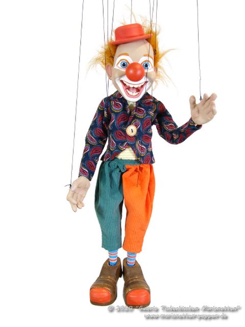 Klaun Chechtal originální česká loutka marioneta s niťovým vedením rukou a vahadlem.