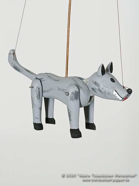 Vlk dřevěná klasická loutka marioneta na drátě.